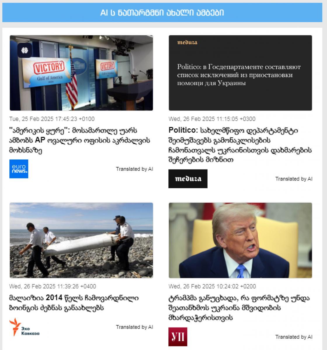 ახალი ამბების სააგენტო „ექსპრესნიუსმა“ თავის ვებ-გვერდზე ხელოვნური ინტელექტის მომსახურება დაამატა. ამიერიდან სააგენტოს მკითხველები ონლაინ, უწყვეტ რეჟიმში მიიღებენ ახალ ამბებს მსოფლიოში მიმდინარე ამბებზე. AI იღებს და თარგმნის ახალ ამბებს ოთხი წამყვანი საინფორმაციო საშუალებიდან. „ეხო კავკაზა“ არის მედიასივრცე, რომელიც ითვალისწინებს კავკასიის რეგიონის ახალ ამბებსს, სოციალურ და პოლიტიკურ საკითხებზე. ის მიწვდება ინფორმაციას ადამიანებზე, მოვლენებზე და ისეთ თემებზე, რაც ამ რეგიონში ხდება. „ეხო კავკაზა“ თავისი საქმიანობის ფარგლებში ვრცელებს სტატიებს, რეექციებს, ანალიზებს და ინტერვიუებს, რაც მკითხველისთვის ძალიან საინტერესო და ვრცელი მონაცემების წყაროს წარმოადგენს. ორგანიზაციის მიზანია, ხელი შეუწყოს რეგიონალური ამბების მისაწვდომობას და ხარისხიანი ჟურნალისტიკის სტანდარტებს. აღსანიშნავია რომ „ეხო კავკაზა“ ავრცელებს ახალ ამბებს ოკუპირებული აფხაზეთიდან და ცხინვალის რეგიონიდან. „ევრონიუსი“ არის საერთაშორისო მედიაორგანიზაცია, რომელიც ცენტრირებული აქვს ბრიუსელში, ბელგიაში. იგი ფონდის მიხედვით დაფინანსებული არხია, რომელიც ძირითადად ევროპაში და მსოფლიოს სხვა ქვეყნებში მოვლენების გაწვდას ახორციელებს. „ევრონიუსი“ ცნობილია ნეიტრალური და უახლესი ინფორმაციის მიწვდით, რომელიც მოიცავს პოლიტიკურ, ეკონომიკურ, სოციალურ და კულტურულ საკითხებს. ნაკლებად რაც შეეხება მისი კონკრეტული ფუნქციები: მულტილინგვალური პროგრამირება: „ევრონიუსი“ ბევრ ენაზე იტვირთავს ინფორმაციას, რაც ეხმარება ფართო აუდიტორიას და ხალხს, ვისაც مختلف ენებზე საუბარი სურს. აღიარებული ჟურნალისტიკა: „ევრონიუსი“ ცნობილია მაღალი ხარისხის და პროფესიონალური ჟურნალისტიკის სტანდარტებით, რაც მას მაყურებლების ნდობას უზრუნველყოფს. „მედუზა“ არის რუსული ონლაინ მედია, რომელიც დაფუძნდა 2014 წელს და თავდაპირველად დაიწყო როგორც დამოუკიდებელი საინფორმაციო რესურსი. მისი მთავარი მიზანი იყო ხარისხიანი ჟურნალისტიკის გაწვდვა და თავისუფალი, ობიექტური ინფორმაციის მიწვდვა რუსულენოვან აუდიტორიაზე. „მედუზა“ წერს პოლიტიკური, სოციალური და კულტურული საკითხების შესახებ, ასევე ეკონომიკის, გარემოს, ჯანმრთელობის და სხვა მნიშვნელოვან თემებზეც. „უკრაინსკაია პრავდა“ (Українська правда) არის უკრაინული ონლაინ მედიასაშუალება, რომელიც დაარსდა 2000 წელს. ეს გამოცემა პირველ ყოვლისა ცნობილია მისი დამოუკიდებელი და კრიტიკული მიდგომით ქვეყნის პოლიტიკის, ეკონომიკის და სოციალური თემების მიმა