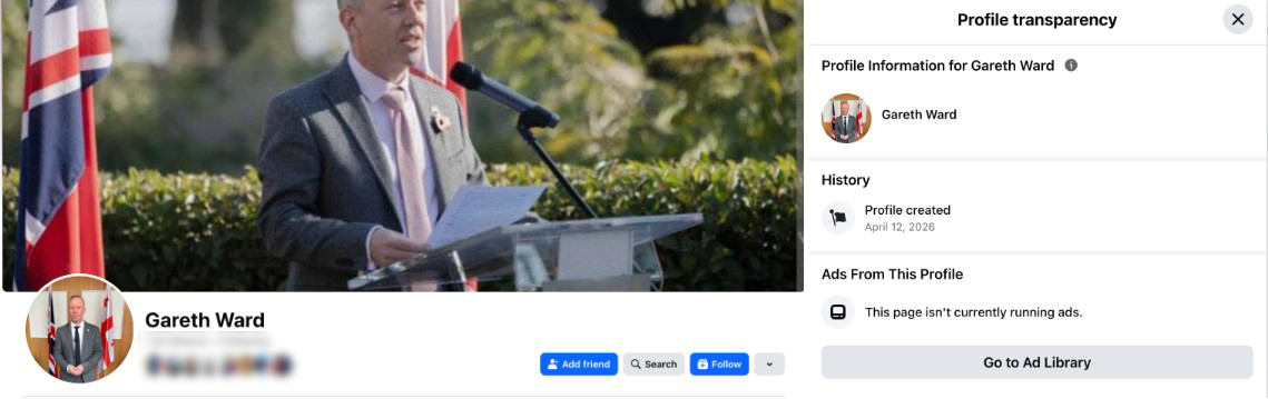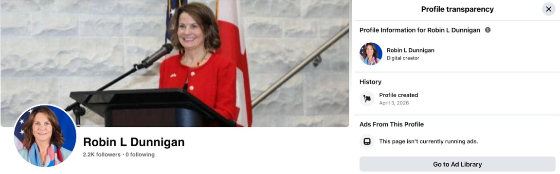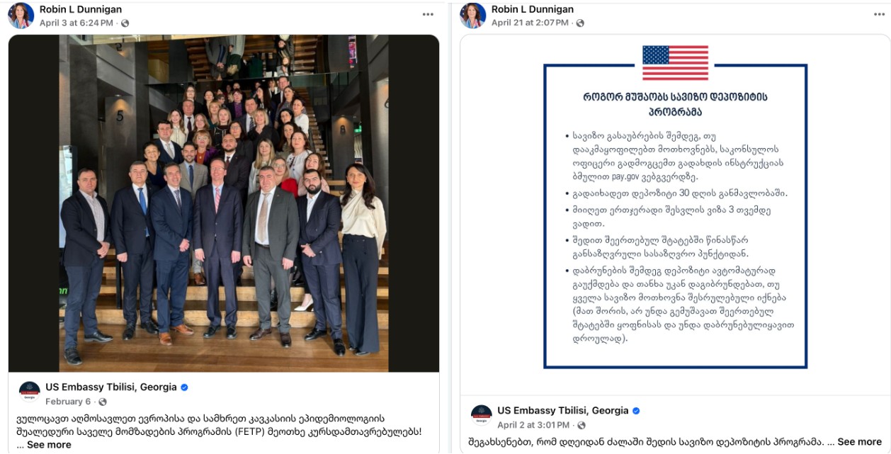 მითების დეტექტორმა სოციალურ ქსელში საქართველოში ამერიკის ყოფილი ელჩის, რობინ დანიგანისა და ბრიტანეთის მოქმედი ელჩის, გარეტ უორდის სახელით გახსნილი ყალბი ანგარიშები აღმოაჩინა, მათ მიერ მომზადებულ მასალაში წერია, რომ რობინ დანიგანის ანგარიშს, რომელიც 2026 წლის 3 აპრილს არის რეგისტრირებული, 27 აპრილის მონაცემებით 2,5 ათასი მიმდევარი ყავს, გარეტ უორდის ფეისბუქ პროფილს, რომელიც 12 აპრილს არის დარეგისტრირებული კი 27 აპრილის მონაცემებით, – 1 300 მიმდევარი. აღნიშნული პროფილების არაავთენტურობა საქართველოში დიდი ბრიტანეთისა და ამერიკის საელჩოებმაც დაუდასტურეს. გარდა ამისა, საუბარია სხვა გარემოებებზეც, რომლებიც პროფილის საეჭვოობაზე მიუთითებს: