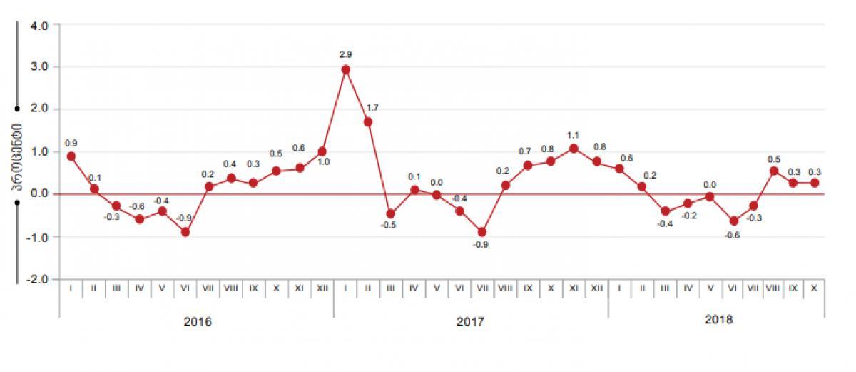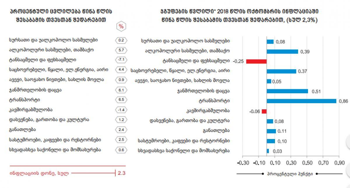 სტატისტიკის ეროვნული სამსახურის ინფორმაციით, 2018 წლის ოქტომბერში წინა თვესთან შედარებით ინფლაციის დონემ საქართველოში 0,3 პროცენტი, ხოლო წლიური ინფლაციის დონემ 2,3 პროცენტი შეადგინა. საქსტატის ცნობით, ერთი თვის განმავლობაში ფასები ტანსაცმელსა და ფეხსაცმელზე გაიზარდა. ხოლო თამბაქო და ალკოჰოლური სასმელები 0,7 პროცენტით გაძვირდა. რაც შეეხება წლიურ ჭრილს: ალკოჰოლური სასმელები, თამბაქო: ფასები გაიზარდა 5,7 პროცენტით. ფასები მომატებულია როგორც თამბაქოს ნაწარმზე (9,5 პროცენტი), ისე ალკოჰოლურ სასმელებზე (1,9 პროცენტი); საცხოვრებელი, წყალი, ელექტრო ენერგია, ბუნებრივი აირი: ფასები გაიზარდა 4,4 პროცენტით.